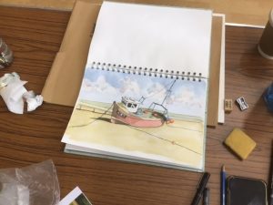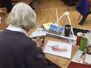 As our normal meeting on March 12th at The Revelstoke Room in Noss Mayo had to be cancelled due to the NNATS ‘Panto’ preparations, one of our group Caroline Taylor kindly offered us her dining room to paint in. The weather was a bit dismal which was a shame, as the view from her windows of the River Yealm are superb. However we had a good turnout and everyone thoroughly enjoyed the session as you can see from the photo below.