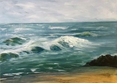 I painted in my youth but once married, with 4 children and my husband and I running our own business of village shops and beach shops, there was little time so it was put on the back burner. However since retiring and children leaving home I started painting again. I dabbled in pottery for a short time but painting was my favourite pastime. I paint quickly and I like painting wet into wet because it blends well.. I like landscape and seascape but have tried my hand at still life in the past. I do paint from my imagination but I do think I should try more local scenes. Since becoming a member of the Yealm Art Society, I have joined one of their paint together groups,I am really glad I joined this group as I’m sure it has helped improve my art.